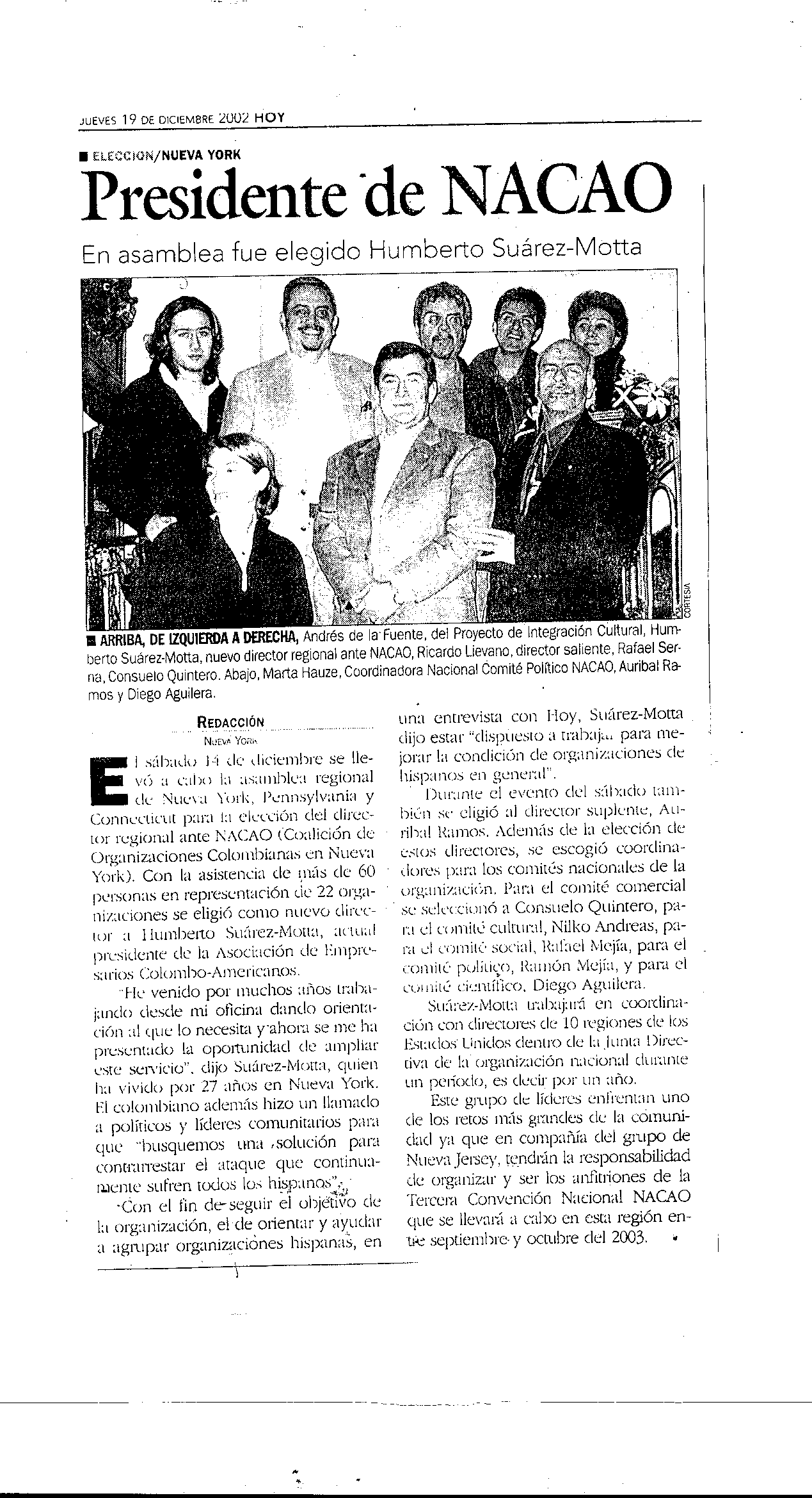 Eligen en Nueva York al doctor Humberto Suárez-Motta, nuevo director regional de NACAO, en Nueva York en cabeza de de la Asociación de Empresarios Colombo-Americanos y la Coalición de Organizaciones Colombo-Americanas en la zona tri-estatal de Nueva York, Connecticut y Pennsylvania.